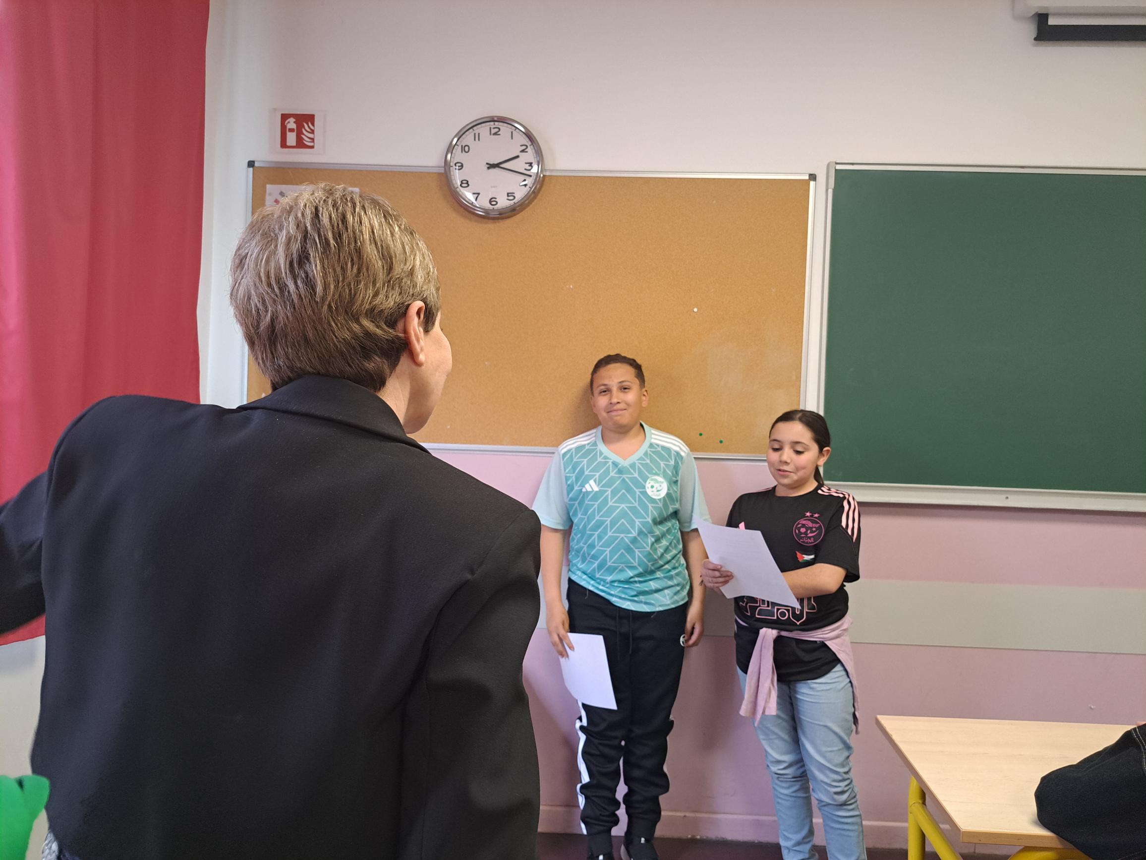 Puis, ils ont préparé des questions (sur sa vie, sa carrière, les mécanismes d’un tournage, …), un petit mot pour que chacun se présente, un texte que des ambassadeurs ont lu au nom de la classe, … Certains lui avaient même cuisiné des gâteaux orientaux et réalisé son portrait !